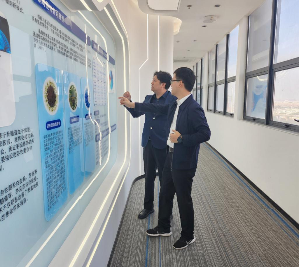 第一时间,坪山区科技创新局刘颖杰局长一行在史渊源董事长的陪同下参观了智慧展厅、生产车间及研发实验室,分析了公司的创始人团队、企业开展历程、细胞治疗的开展史及现状、服务平台建设及企业愿景等,对深圳evo真人视讯在生物医药这一新兴产业上、为药企给予细胞原创药物的“研发—生产—申报—人才培养”的全产业链服务,为细胞与基因治疗领域的开展赋能,给予了充分的肯定。